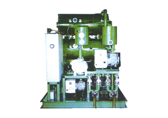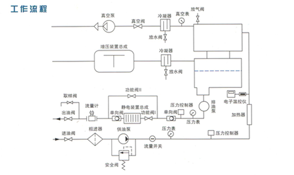 油液在供油泵的作用下由進油口進入粗濾器,通過粗濾器除去油中較大雜質后經過加熱器時被加熱到55℃左右,加熱后的油液首先通過初級真空罐內的脫氣元件噴射到真空罐內,在真空狀態下,水份會低溫沸騰而變成水蒸氣,然后被真空泵抽出,被抽出的水蒸氣在通過冷凝器時大部分被冷凝成水,小部分透過真空排氣口排出。